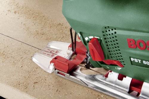 Scie sauteuse PST 700 E Easy. Taille compacte, excellente maniabilité, utilisation très confortable. Grande précision grâce au variateur électronique Bosch. Vibrations minimales grâce au système Low Vibration avec équilibrage linéaire des masses. Moteur puissant de 500 W et profondeur de coupe dans le bois de 70 mm, même les travaux les plus difficiles sont facilement réalisables. Avec le système SDS Bosch, le changement de lame est rapide, sûr et efficace, sans outil. La fonction soufflerie (désactivable) permet, en toutes circonstances, une bonne visibilité de la ligne de coupe. Réglage de la plaque de base pour une coupe d'onglet jusqu'à 45 degrés. Raccord pour l'aspiration des poussières (pour un travail sans pous...