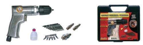 - Coffret perceuse/dévisseuse, contient: 1 perceuse visseuse/dévisseuse pneumatique 2200tr/mn, un mandrin auto serrant de diamètre 10 mm, 10 forêts HSS, 2 inserts rapides,